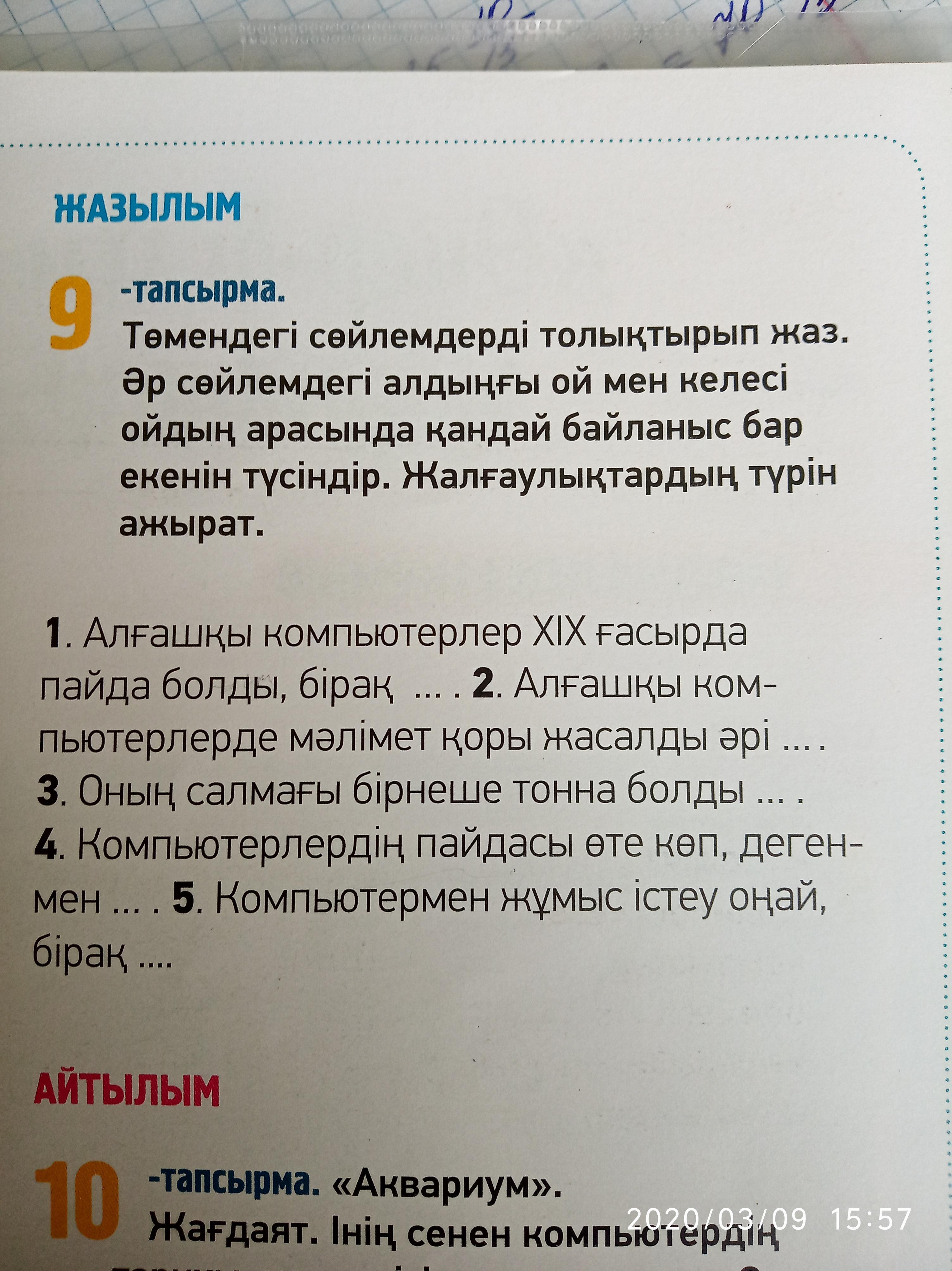 1. бірақ оның құрылымын ертеректе Кәріс халқы ойлап тапты. (жалғаулық -бірақ қарсылықты жалғаулық)2. ол мәліметтерді өндеуге мүмкіндік болды (-әрі ыңғайлас салалас жалғаулығы) 3. болды, көптеген функциялардан құрылды. 4. зияныда баршылық. ( дегенмен ынғайлас жалғаулығы) 5. оны кез - келген жерге өзінмен алып жүре алмайсын.