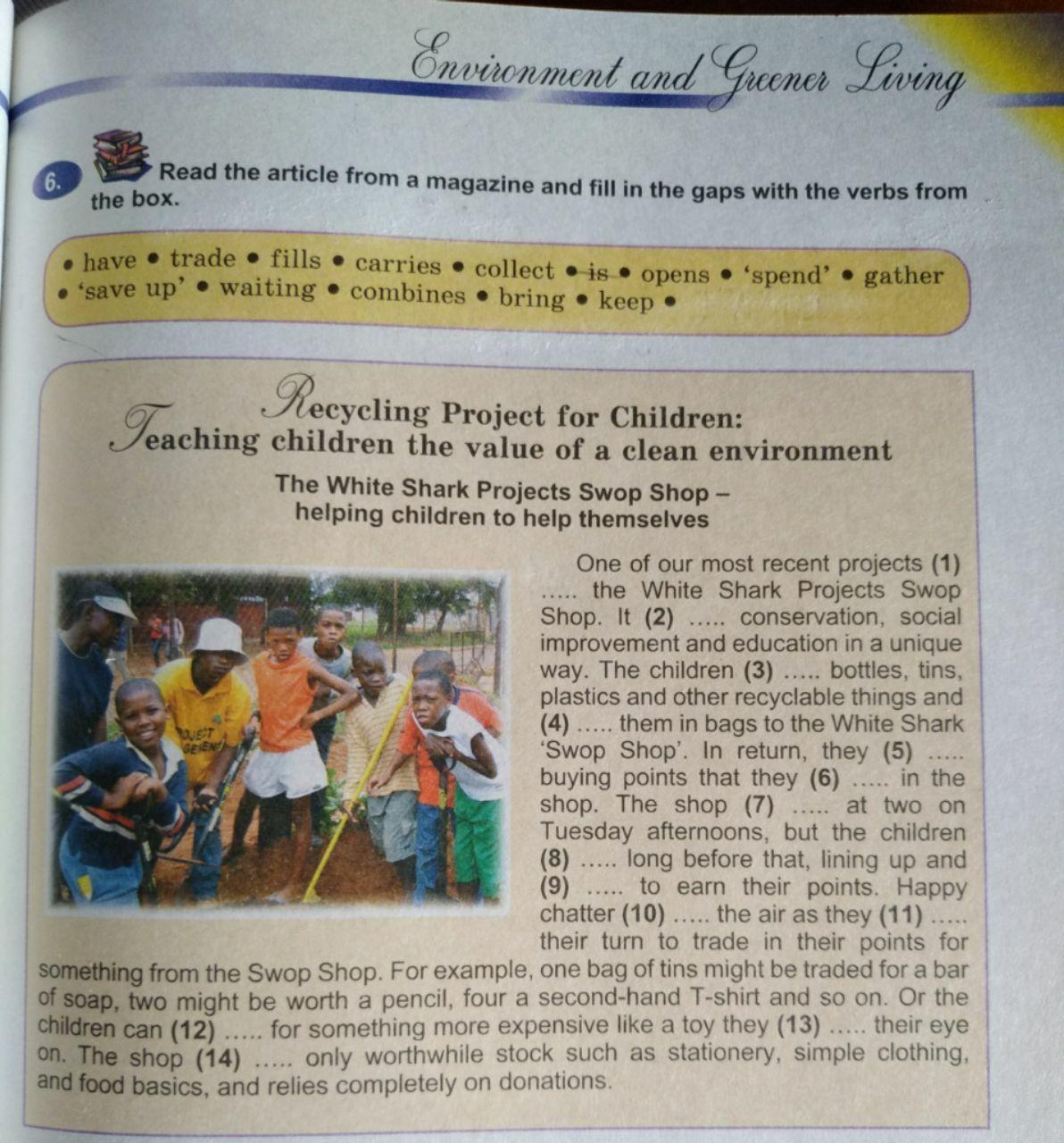 One of our most recent projects is the White Shark Projects Swop Shop. It (combines) a conservation, social improvement and education in a unique way. The children (gather) bottles, tins, plastics and other recyclable things and (keep) them in bags to the White Shark 'Swop Shop'. In return, they (spend) buying points that they (save up) in the shop. The shop (opens) at two on Tuesday afternoons, but the children (collect) long before that, lining up and (bring) to earn their points. Happy chatter (carries) the air as they (have) their turn to trade in their points for something from the Swop Shop. For example, one bag of tins might be traded for a bar of soap, two might be worth a pencil, four a second-hand T-shirt and so on. Or the children can (waiting) for something more expensive like a toy they (trade) their eye on. The shop (fills) only worthwhile stock such as stationery, simple clothing, and food basics, and relies completely on donations.