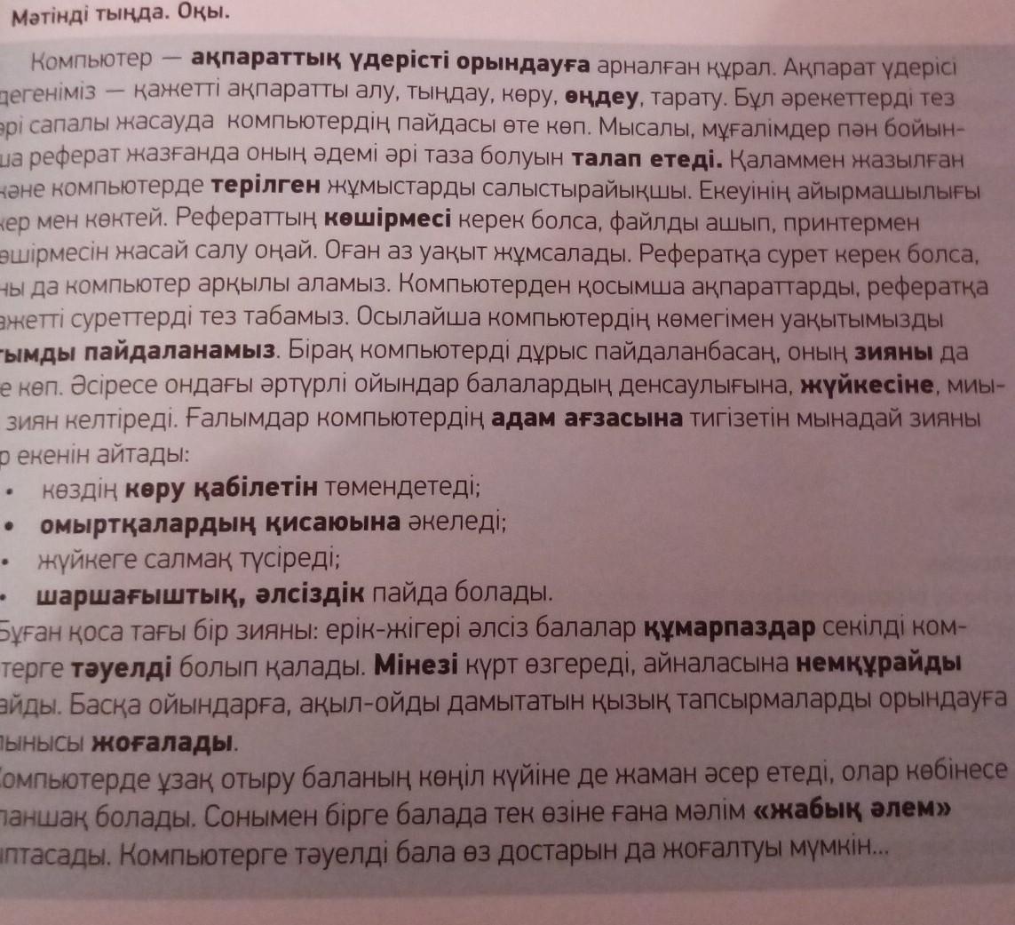 Послушай кусок. Читайте дальше. инструмент для выполнения информационного процесса. Информационные технологии Получение, прослушивание, просмотр, настройка и распространение информации, которая не важна для нас. Компьютер очень полезен, когда дело доходит до этих вещей быстро. Например, когда учителя пишут плакат для панели, они хотят, чтобы она выглядела аккуратно и чисто. Сравните работу с ручкой с ручкой, набранной на компьютере. Разница в небе и небе. Если вам нужна копия реферата, файл легко открыть и скопировать на принтер. Это займет немного времени. Если нам нужна абстрактная картинка, мы также можем получить ее через компьютер. Мы быстро найдем дополнительную информацию о компьютере и фотографии, необходимые для аннотации. Таким образом, мы используем компьютер в наше время. Но компьютер не был использован должным образом. его вред тоже. Особенно различные игры на нем могут нанести вред здоровью, нервозности и мозгу детей. Ученые предположили, что компьютер наносит следующий вред организму человека: уменьшает напряжение тока: приводит к искривлению позвоночника; , кладет вес на шампур; - появляются усталость и слабость. Другим недостатком является то, что слабовольные дети становятся зависимыми, как игроки. Характер резко меняется, и он становится безразличным к окружению. В других играх вы теряете способность выполнять веселые задания, которые развивают интеллект. Длительное сидение за компьютером может плохо повлиять на настроение ребенка, как если бы это была панацея. В то же время ребенок создает «закрытый мир», известный только ему. Ребенок, полный компьютеров, может потерять друзей ...