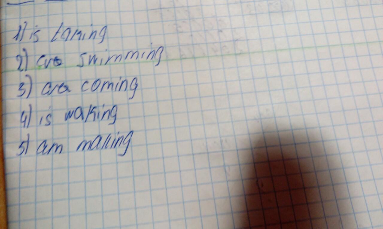 Choose the correct form. Note that there are exceptions in spelling when adding 'ing'. 1.His brother______a test at the moment. 2.They(to swim) ____in the pool. 3.Look!Davig and Max (to come) ____home. 4.My dog Charlie _____to the Park. 5.I(to make) ____breakfast now.
