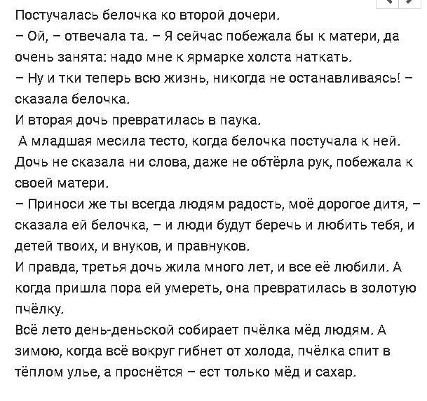 позвала белочка 3 дочерь. дочерь месила тесто и не вытрав руки побежала помогать матери. и белочка превратила её в пчелу.