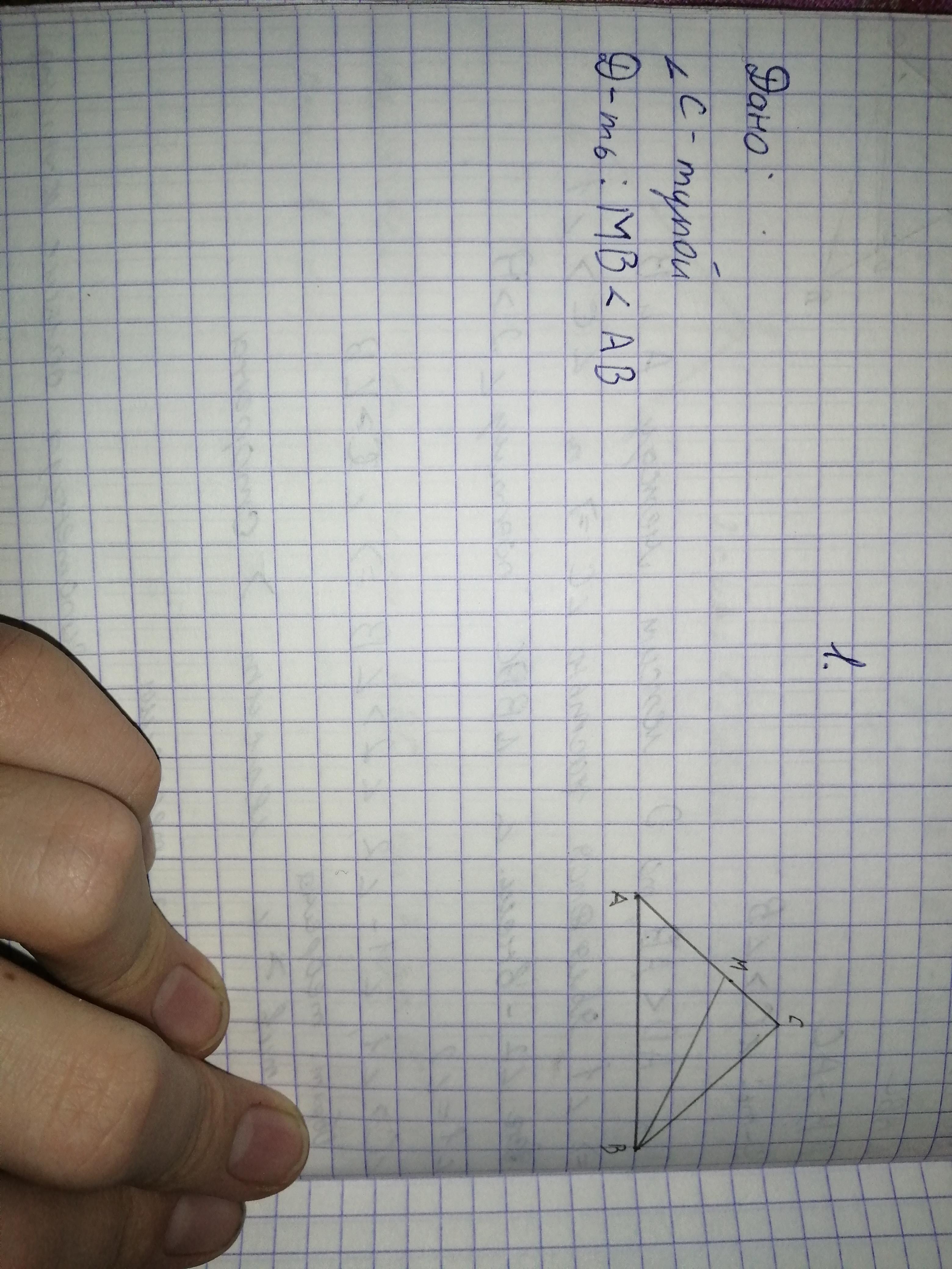 Объяснение: 1) В Δ АВС ∠С - тупой, значит углы А и С острые. 2) Значит в ΔВМС ∠ВМС - острый, значит ∠АМВ - тупой, т.к. ∠ВМС -и ∠АМВ -смежные. 3) Т.к. в треугольнике против меньшего угла лежит и меньшая сторона, то в Δ АМВ МВ<АВ, т.к. сторона Мв лежит против острого угла А, а сторона АВ лежит против тупого угла АМВ, чтд