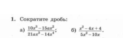1)frac{10x^{3}-15ax^{2}}{21ax^{3}-14x^{4}}=frac{5x^{2}*(2x-3a)}{7x^{3}*(3a-2x)} =-frac{5}{7x}\\2)frac{x^{2}-4x+4}{5x^{2}-10x}=frac{(x-2)^{2}}{5x(x-2)}=frac{x-2}{5x}