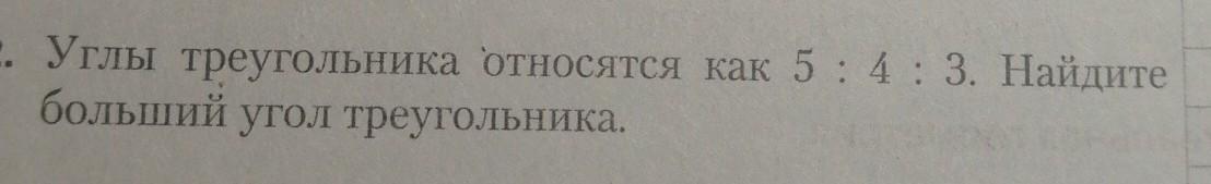 Сумма всех углов в треугольнике равна 180°, если коэффициент пропорциональности х, х>0, то 5х+4х+3х=180, или 12х=180, х=180/12