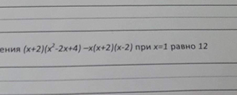 покажите, что значение выражения (х+2)(х^2-2х+4)-х(х+2)(х-2) при х=1 равно 12