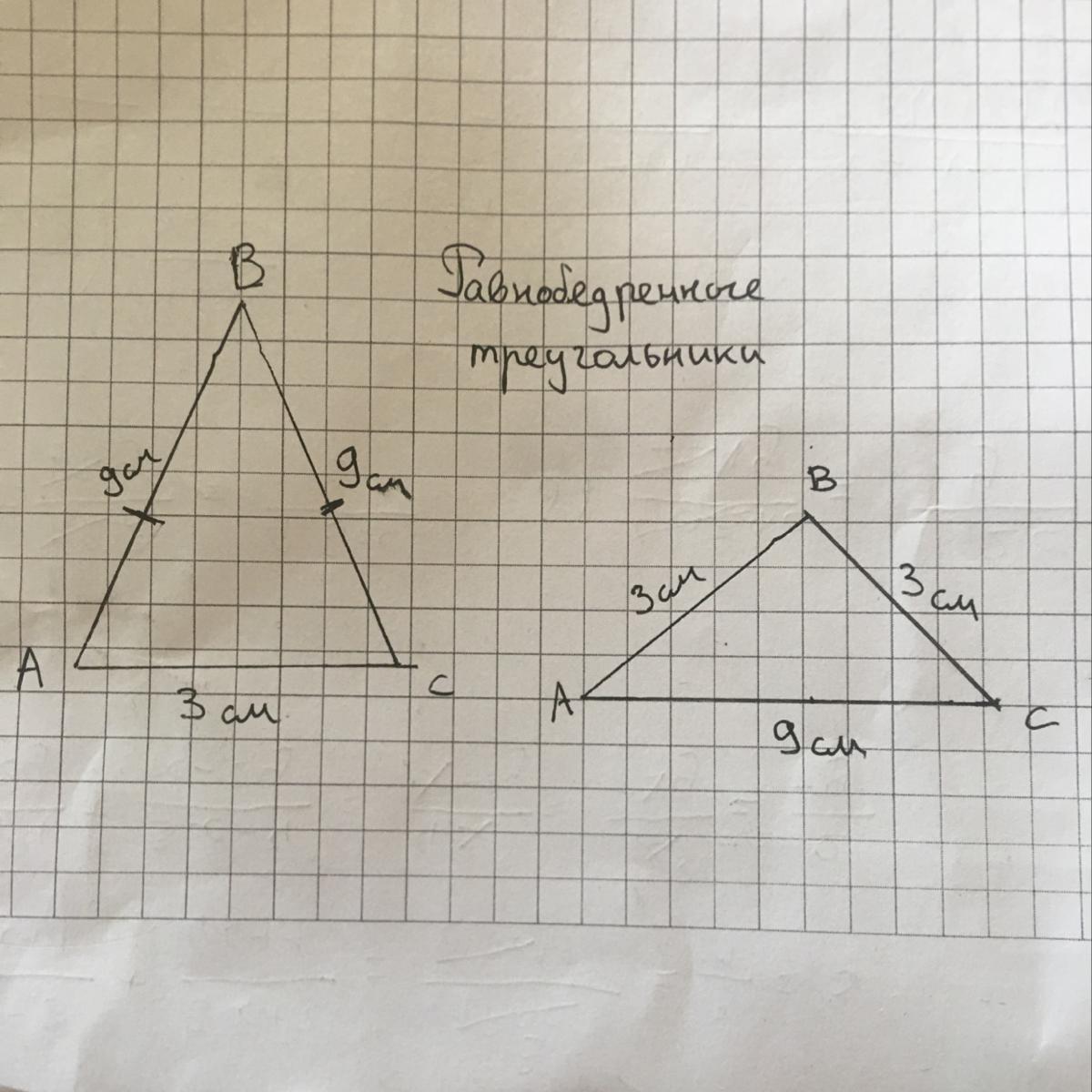 Равнобедренный треугольник -это треугольник с двумя одинаковыми сторонами . Поэтому одна из сторон будет либо 3, а другие две 9 . Либо же одна сторона будет 9, а другие две будут 3 . На фото это более хорошо видно