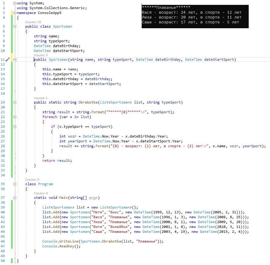 Из данного списка спортсменов распечатать сведения о тех из них, кто занимается плаванием. Указать возраст, сколько лет они занимаются спортом.