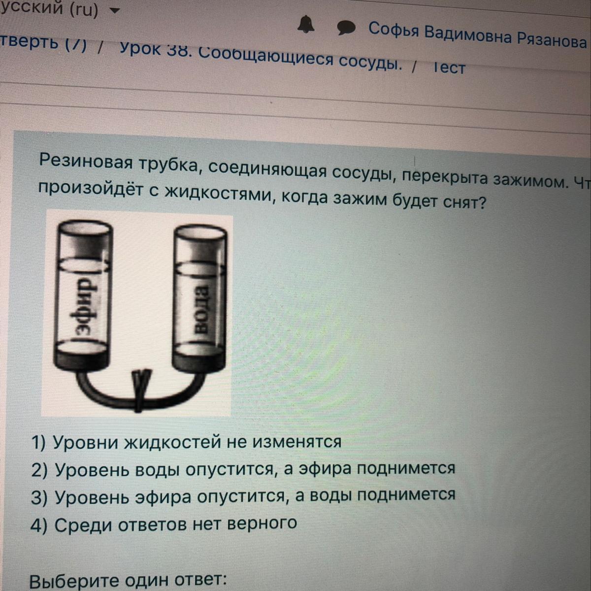 Резиновая трубка соединяющая сосуды перекрыта зажимом. Что произойдёт с жидкостями когда зажим будет снят?