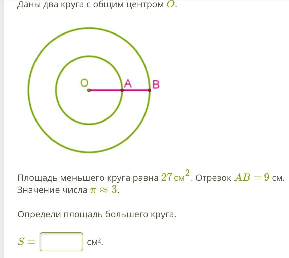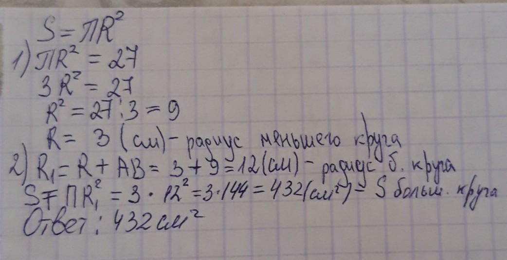 Площадь меньшего круга равна 27см2. Отрезок AB = 9 см.
