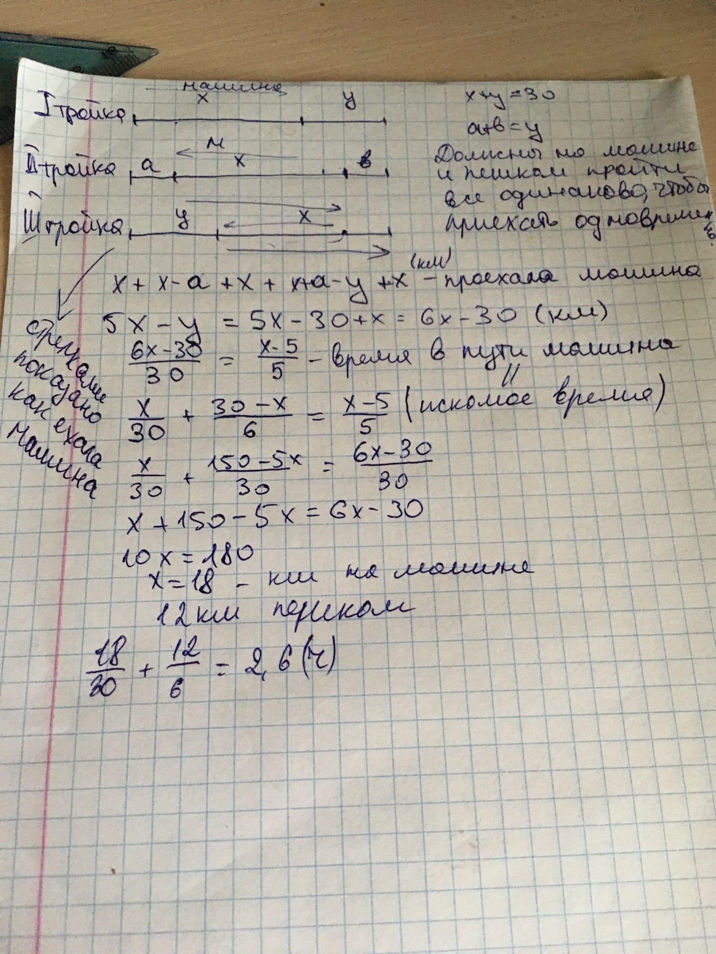 Военный водитель выполнял задание: доставить 36 солдат одновременно в пункт назначения в 30 км от их места расположения. Автомобиль вмещает 12 человек (без водителя) и движется по фронтовым дорогам со скоростью 30 км/ч. Скорость движения солдат 6 км/ч.