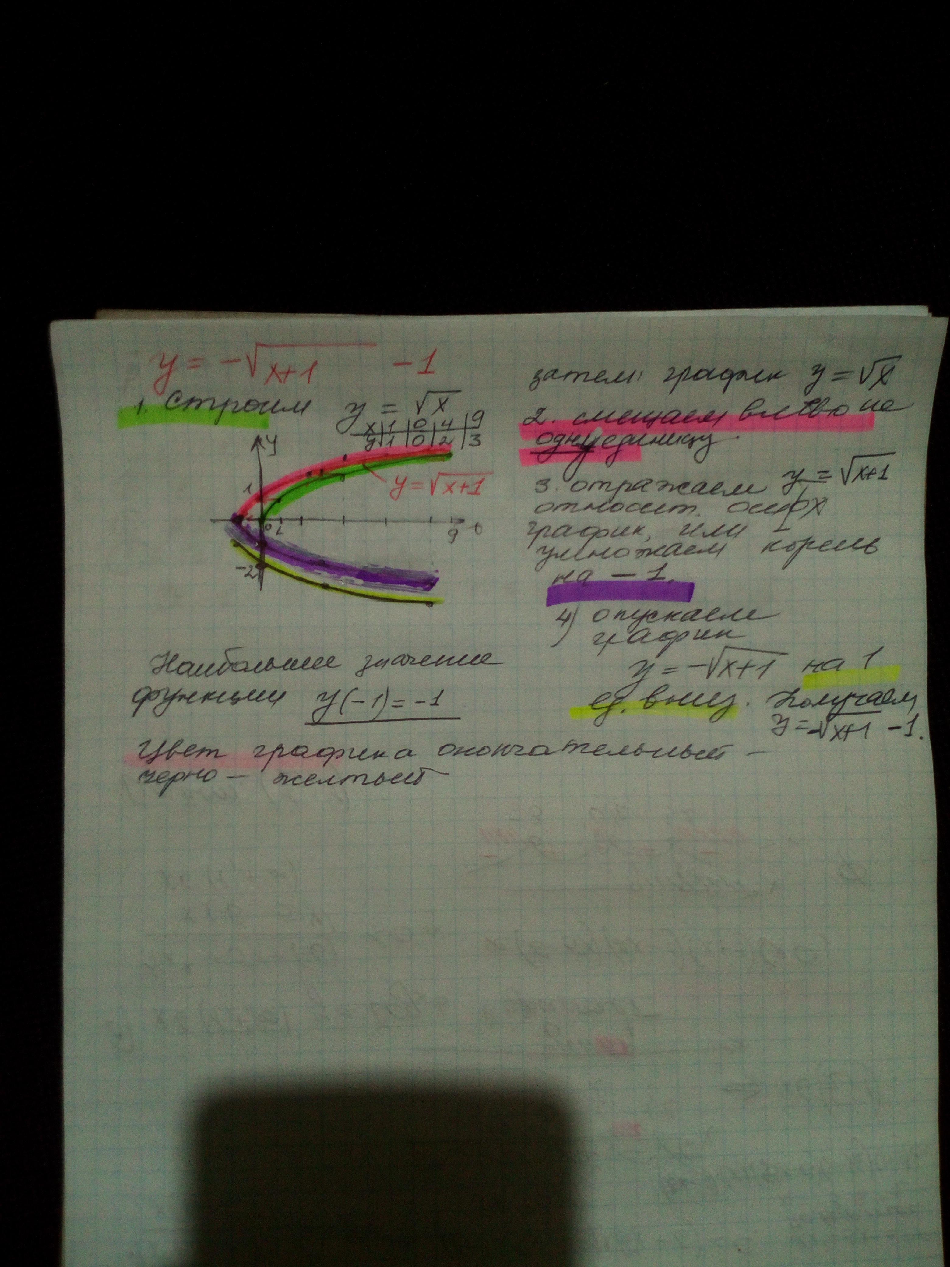 1. Начинаем строить график у =√х, наименьшее значение равно нулю, это корень из нуля, а все остальные значения больше нуля, положительные, затем передвигаем влево график на 1, новый график умножаем на -1, после того, как опустим новый график на единицу, наименьшее значение изменится тоже на единицу и станет равным минус единице.