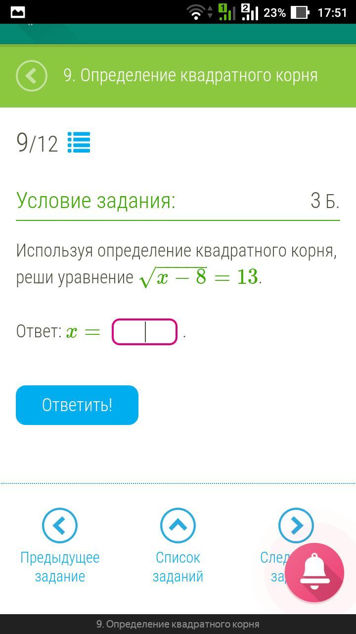 x-8 — какое-то число, из которого извлекли корень и получили 13. Следовательно, чтобы найти это число, нужно 13 возвести в квадрат. Мы получим 169. Дальше получается вот такое уравнение: