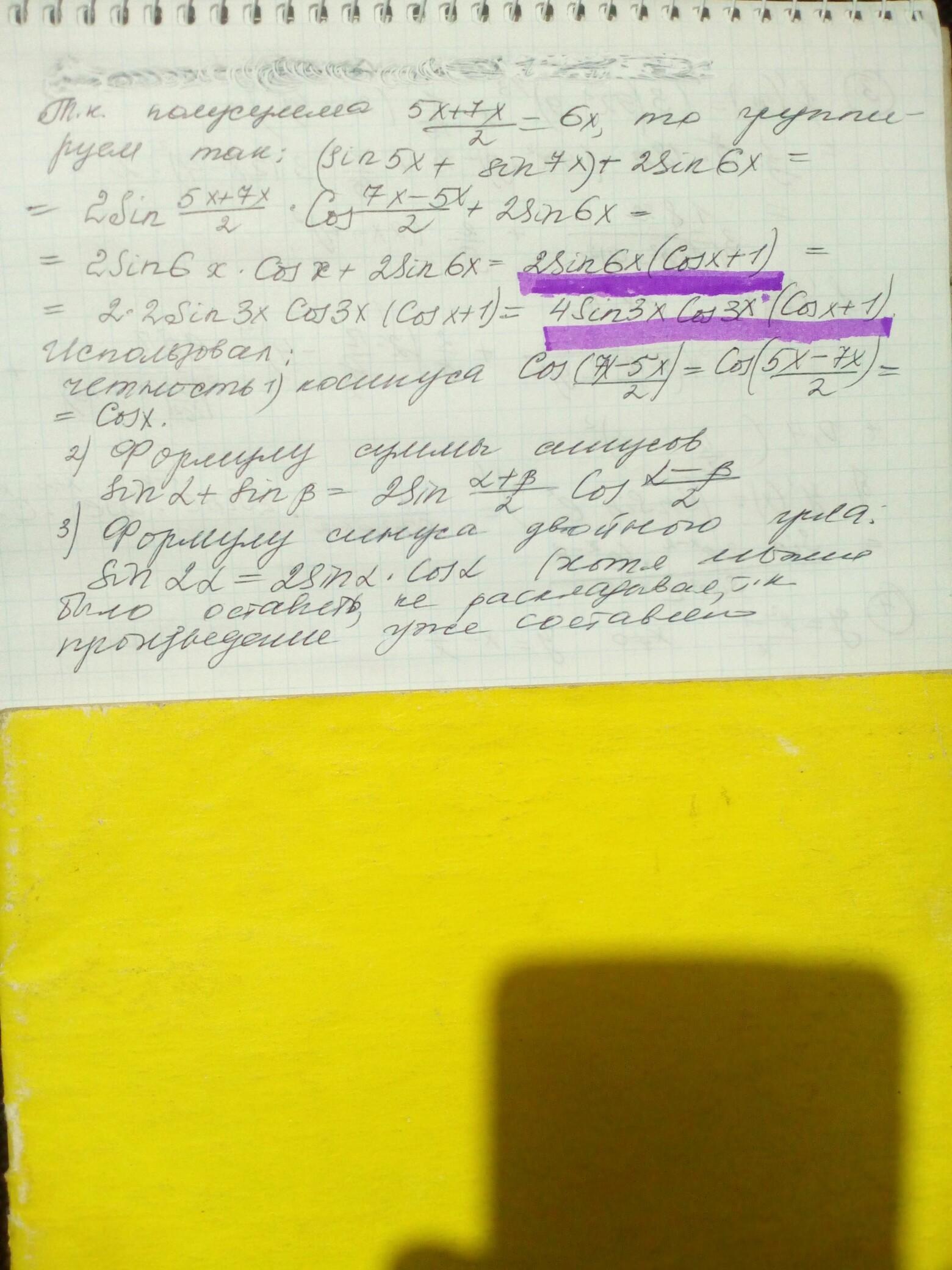 sin5x + sin7x + 2sin6x = 2sin((5x+7x)/2)cos((7x-5x)/2) + 2sin6x =