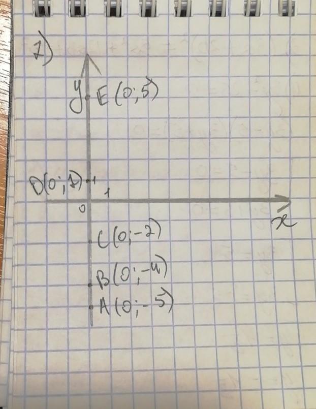 1) Где на координатной плоскости расположены точки с абсциссой равной 0? Построить точки А(0;-5), В(0;-4), С(0;-2), D(0;1) и Е(0;5). Найди закономерность и запиши координаты следующей точки.