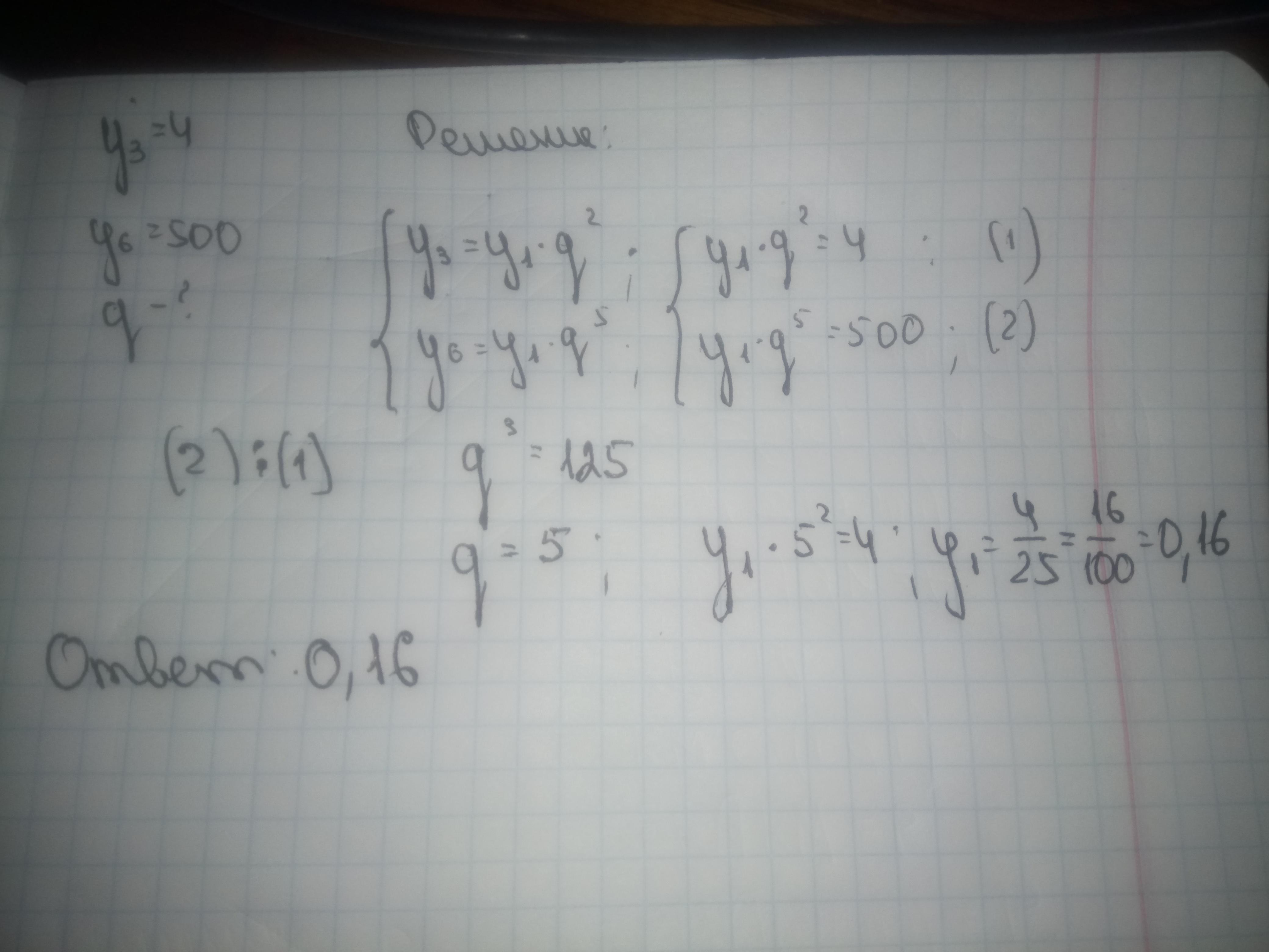 найдите первый член геометрической прогрессии (yn), знаменатель которой равен q, если y3=4, y6=500
