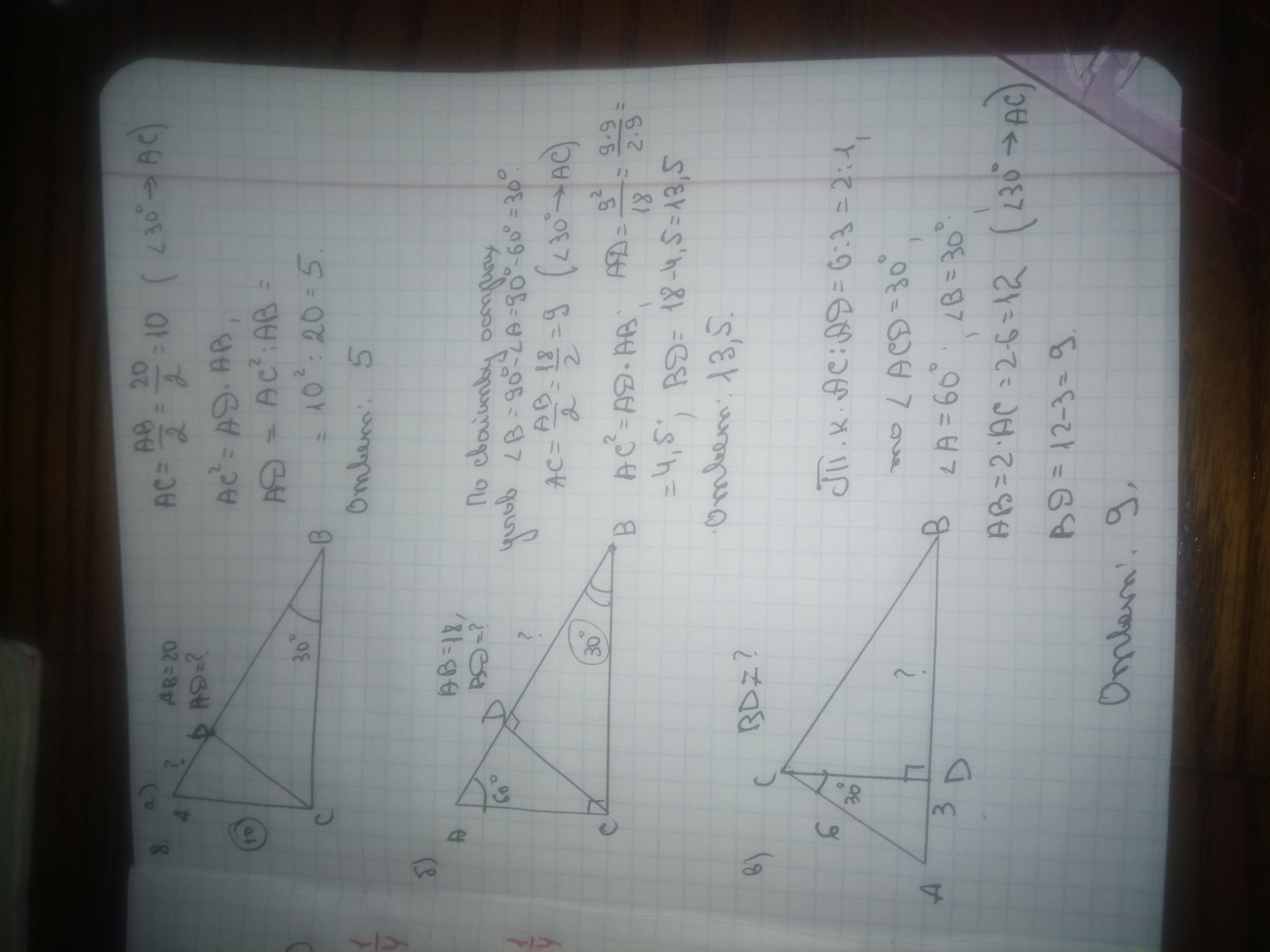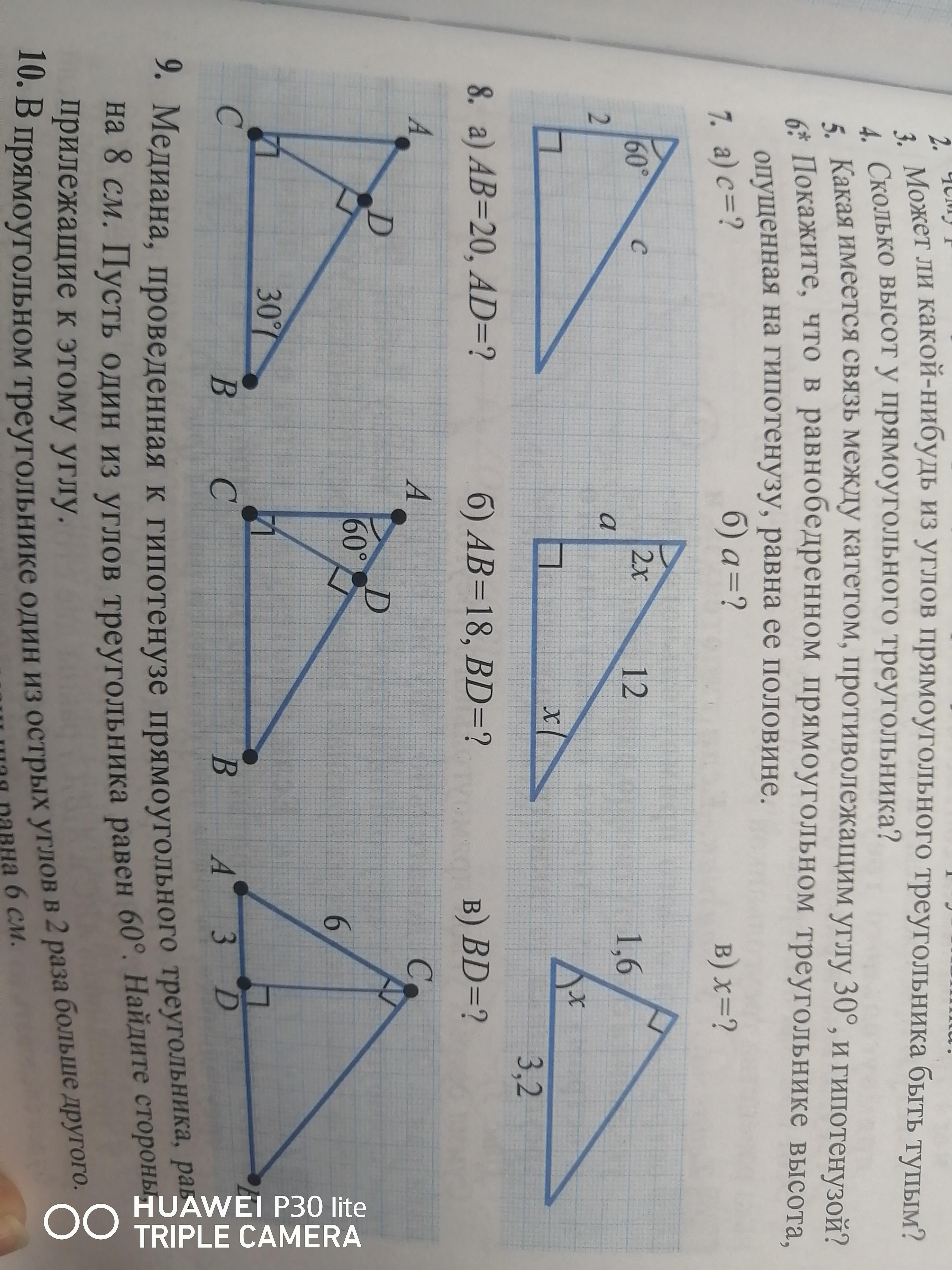 угол В=30° напротив угла в 30 градусов распологается наименьший катет, равный половине гипотенузы, т.е