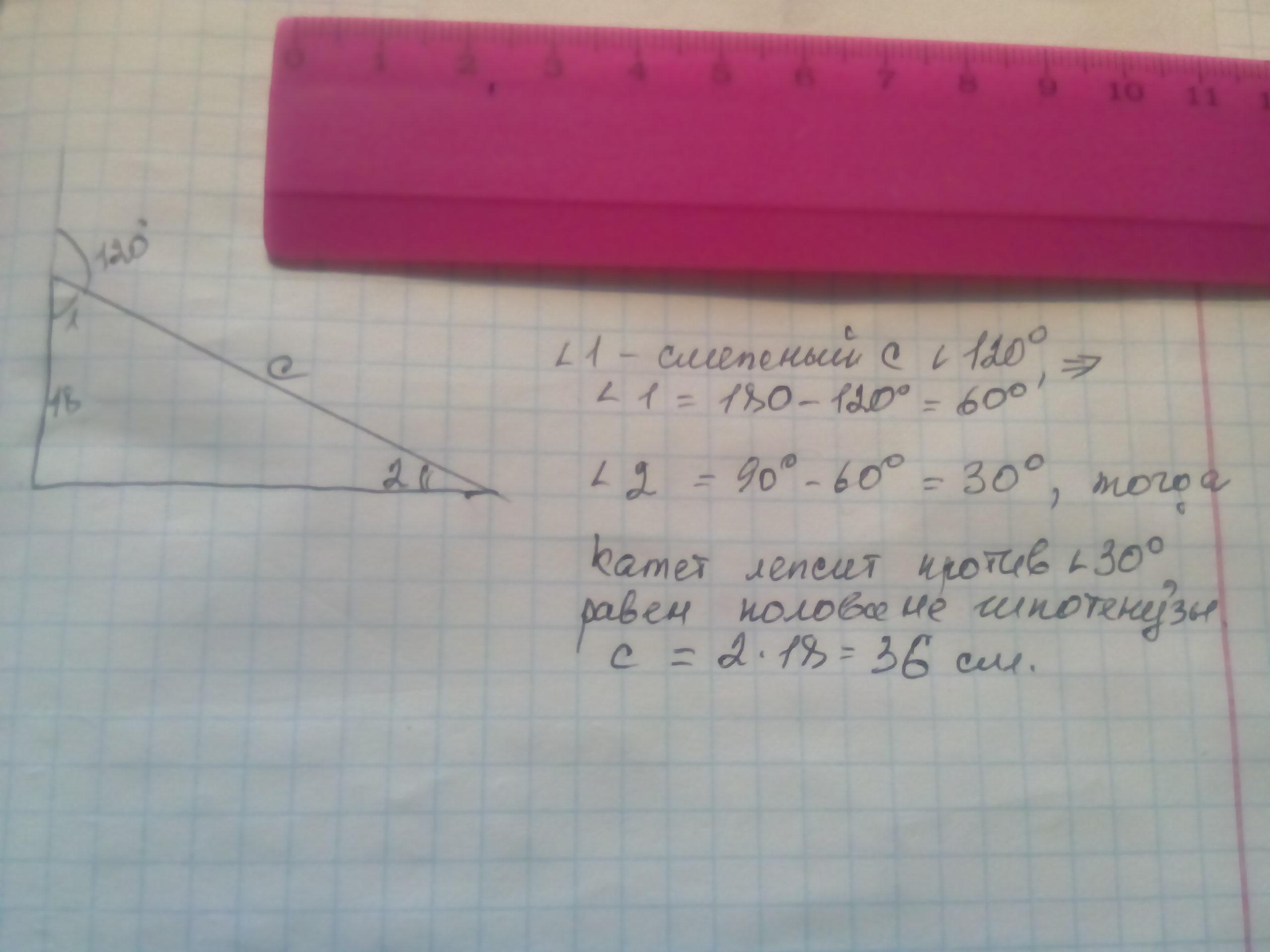 Чему равна гипотенуза прямоугольного треугольника, меньший катет которого равен 18 см, а один из внешних углов этого треугольника — 120^{circ}?