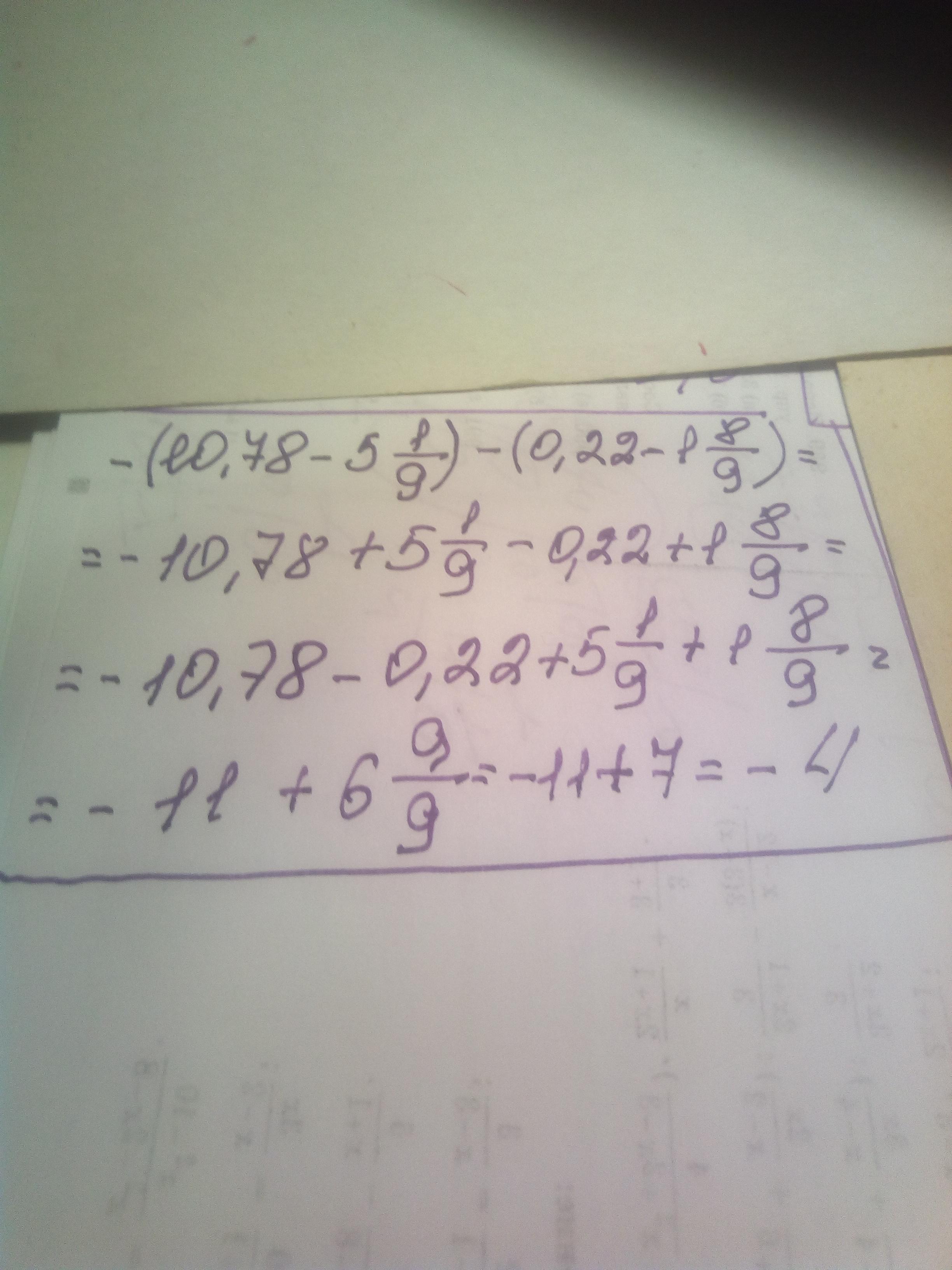 Раскрой скобки и найди значение выражения: −(10,78−5 1/9)−(0,22−1 8/9). Ответ: значение выражения равно