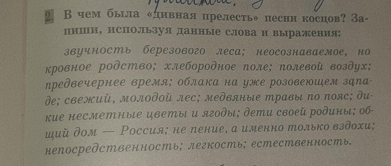 В чём была "дивная прелесть" песни косцов? Запиши используя данные слова и выражения: