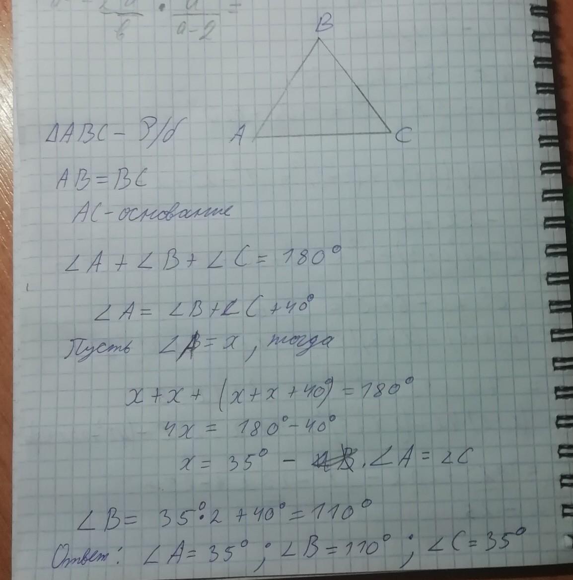найдите углы равнобедренного треугольника, если угол при вершине на 40° больше суммы углов при основании