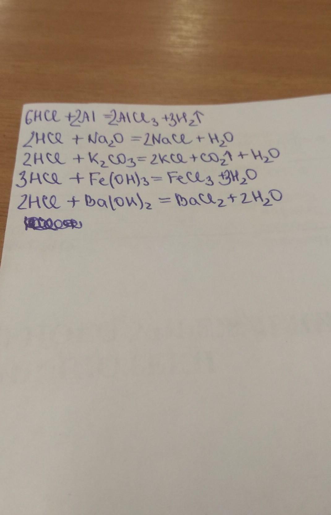 С какими из предложенных веществ будет взаимодействовать раствор соляной кислоты: 1) алюминий 6) нитрат цинка 2) оксид натрия 7) карбонат калия 3) гидроксид железа(III) 8) гидроксид бария 4) медь 9) оксид азота(V) 5) фосфорная кислота Напишите уравнения соответствующих реакций.