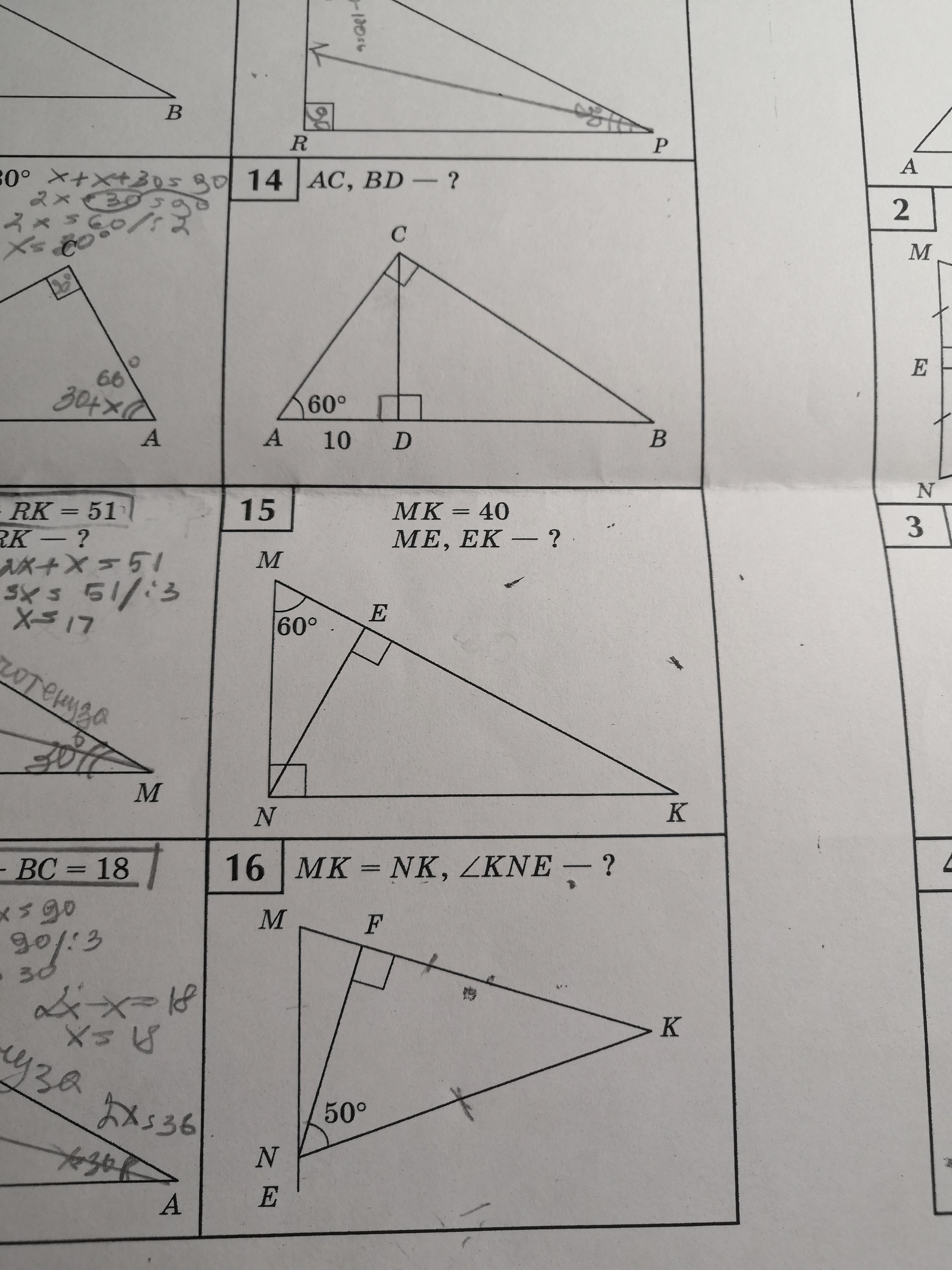5)<K=30, значит MN=1/2MK, MN=40/2=20, <MNE=30, ME=1/2 MN=20/2=10,