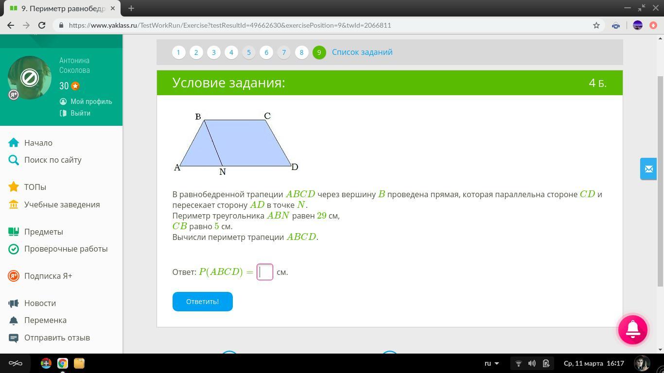 В равнобедренной трапеции ABCD через вершину B проведена прямая, которая параллельна стороне CD и пересекает сторону AD в точке N.