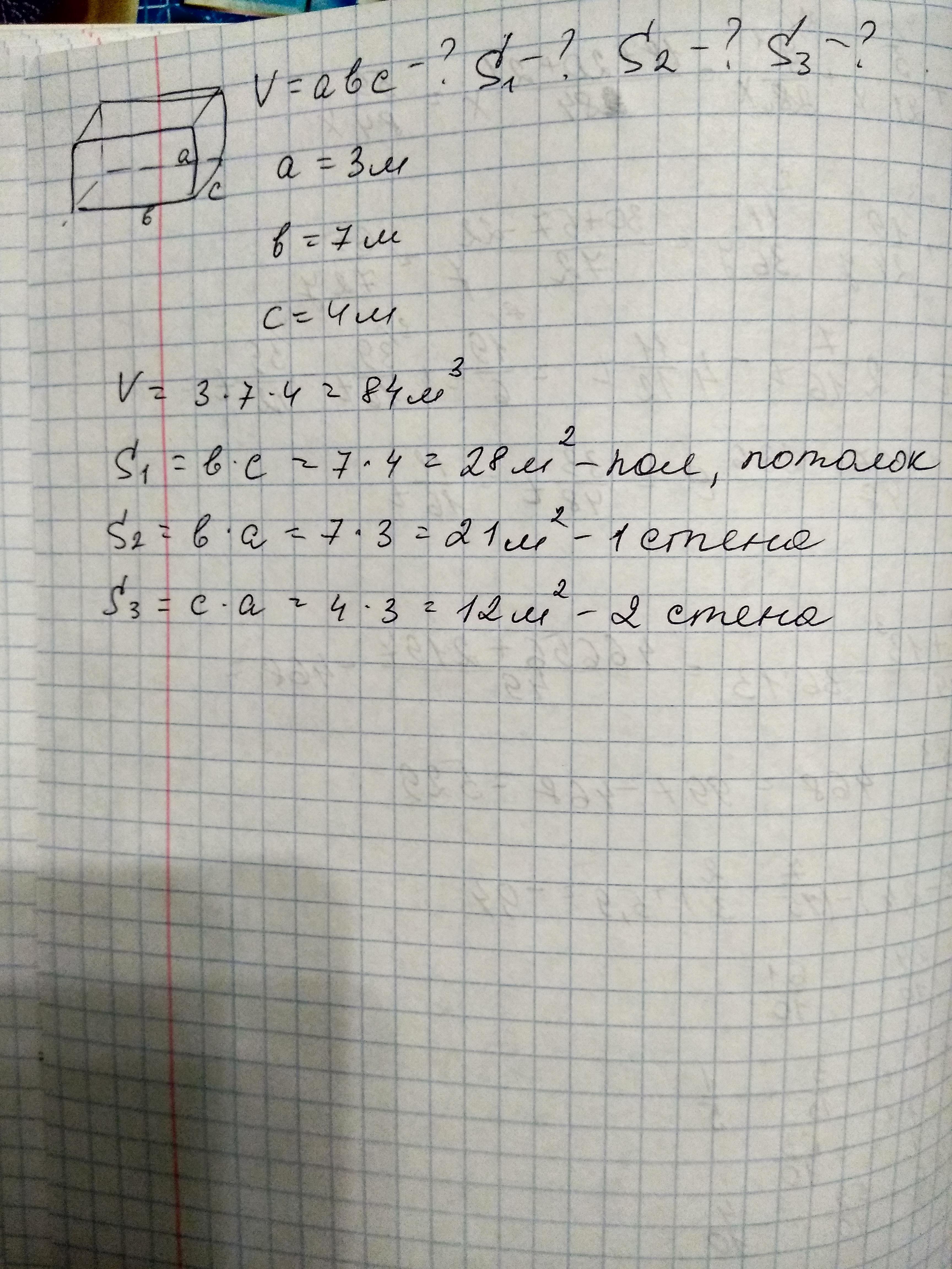 высота комнаты 3метра,ширина 4 метра,а длина 7метров.Сколько кубических метров воздуха помещается в комнате?Какая площадь пола,потолка,стен?