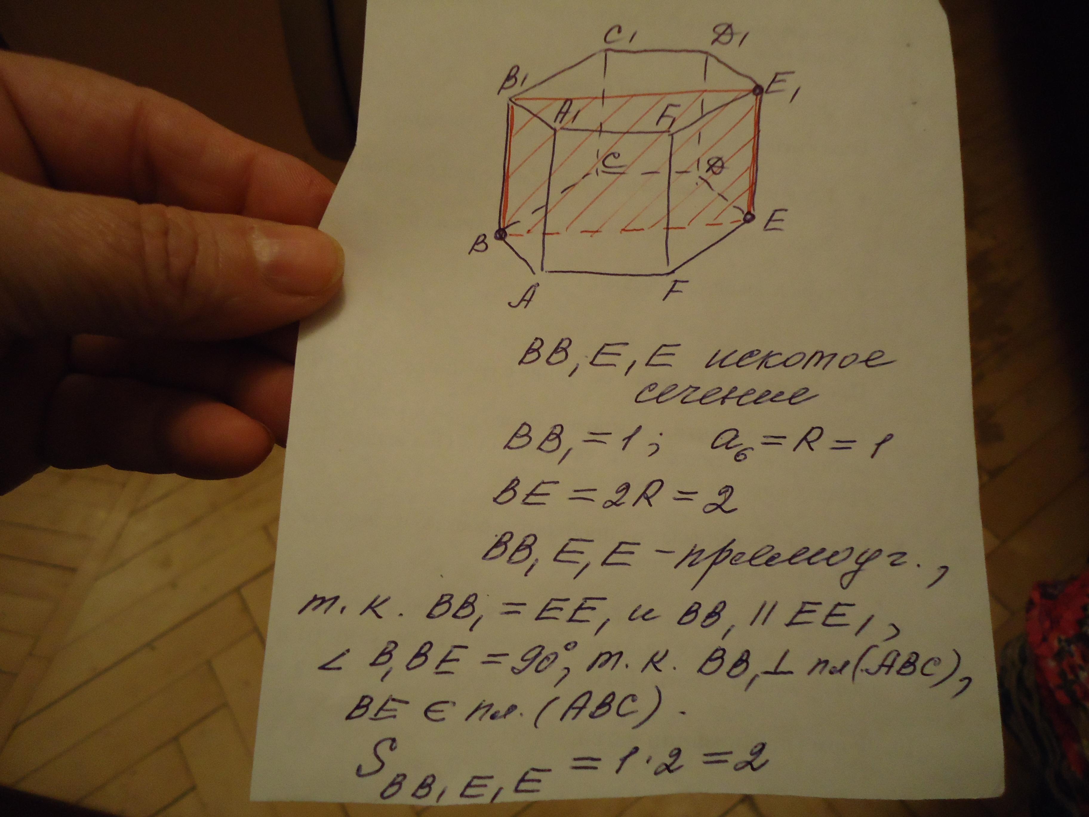 Найдите площадь сечения правильной шестиугольной призмы A B C D A1 B1 C1 D1 E1 F1, все рёбра которой равны 1, плоскостью ,проходящей через вершины B ,E, E1