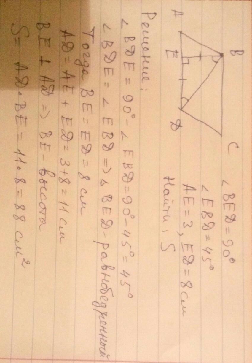 в параллелограмме abcd, на стороне ad отмечена точка e, угол BED=90,а угол ebd=45, ae=3 см,ed=8 см, найдите площадь параллелограмма