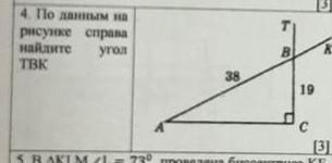 Угол А равен 30° так как катет лежащий против нео в два раза меньше гипотенузы (38/19=2);
