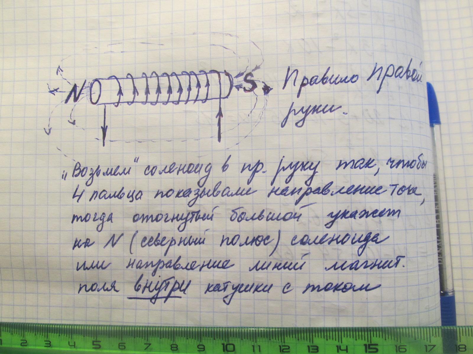 По правилу правой руки большой палец указывает направление тока, 4 согнутых пальца показывают направление магнитного поля