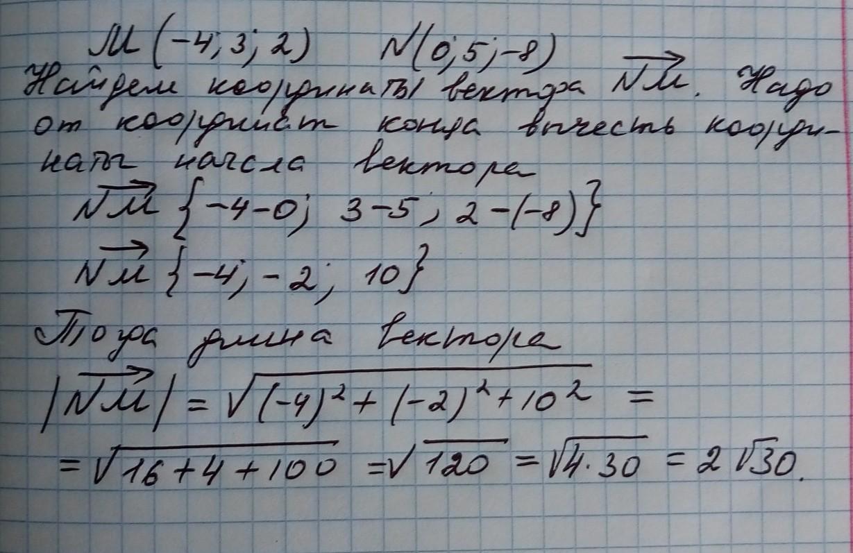 Даны точки M(-4;3;2) и N(0;5;-8). Найдите координаты вектора NM и его длину.