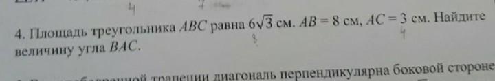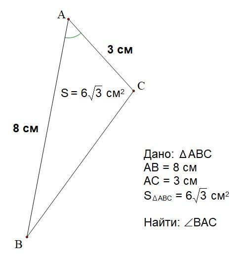 4. Площадь треугольника ABC равна 6 корень из 3. AB=8 см, AC=3 см. Найдите величину угла BAC