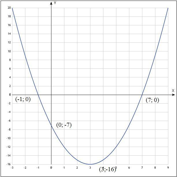 Значит график пересекает ось ОХ в точках (7; 0) и (-1; 0)