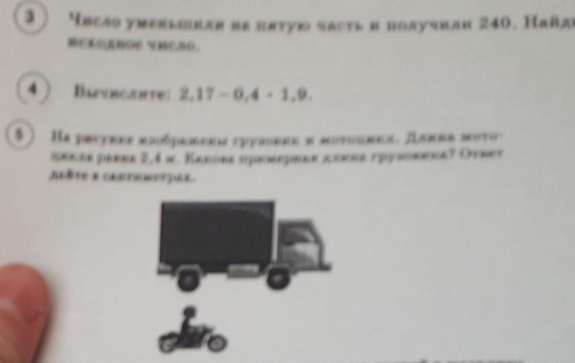 Тут чуть-чуть размыто, но я напишу. На рисунке изображены грузовик и мотоцикл. Длина мотоцикла равна 2,4 м. Какова примерная длина грузовика? Ответ дайте в сантиметрах.