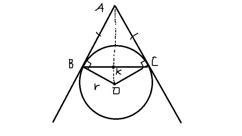 По теореме об отрезках касательных, проведенных из одной точки, AB = AC, AO - биссектриса угла BAC. Обозначим точку К на отрезке АО, причем K ∈ BC.