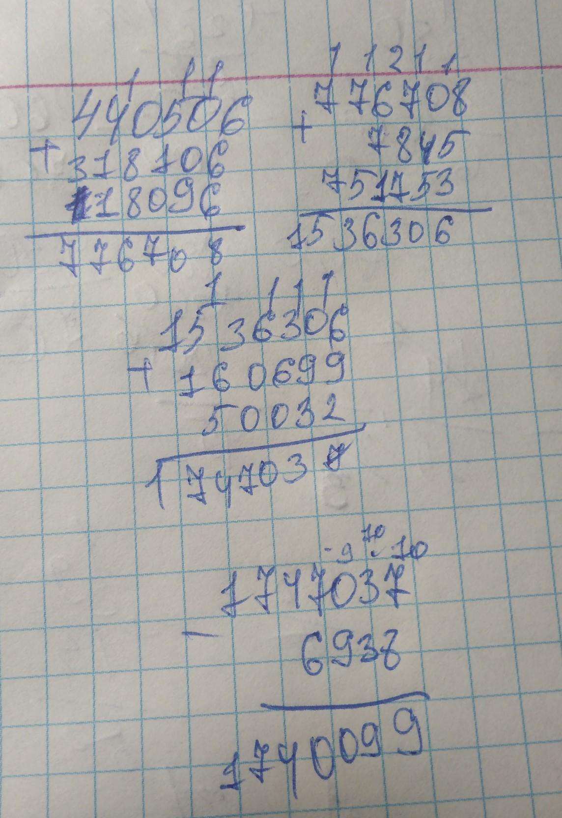 Выполни действия.440506+318106+18096+7845, 751753+160699+50032-693809 помогите пожалуйста в столбик