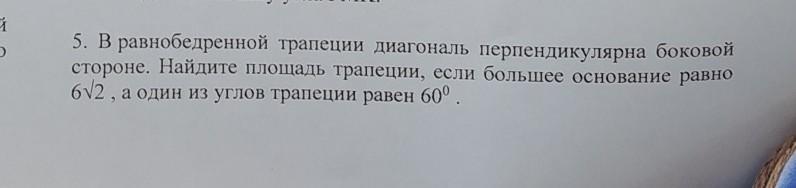 В равно бедренной трапеции диагональ перпендикулярна боковой стороне. Найдите площадь трапеции, если большее основание равно 6√2, а один из углов трапеции равен 60°?