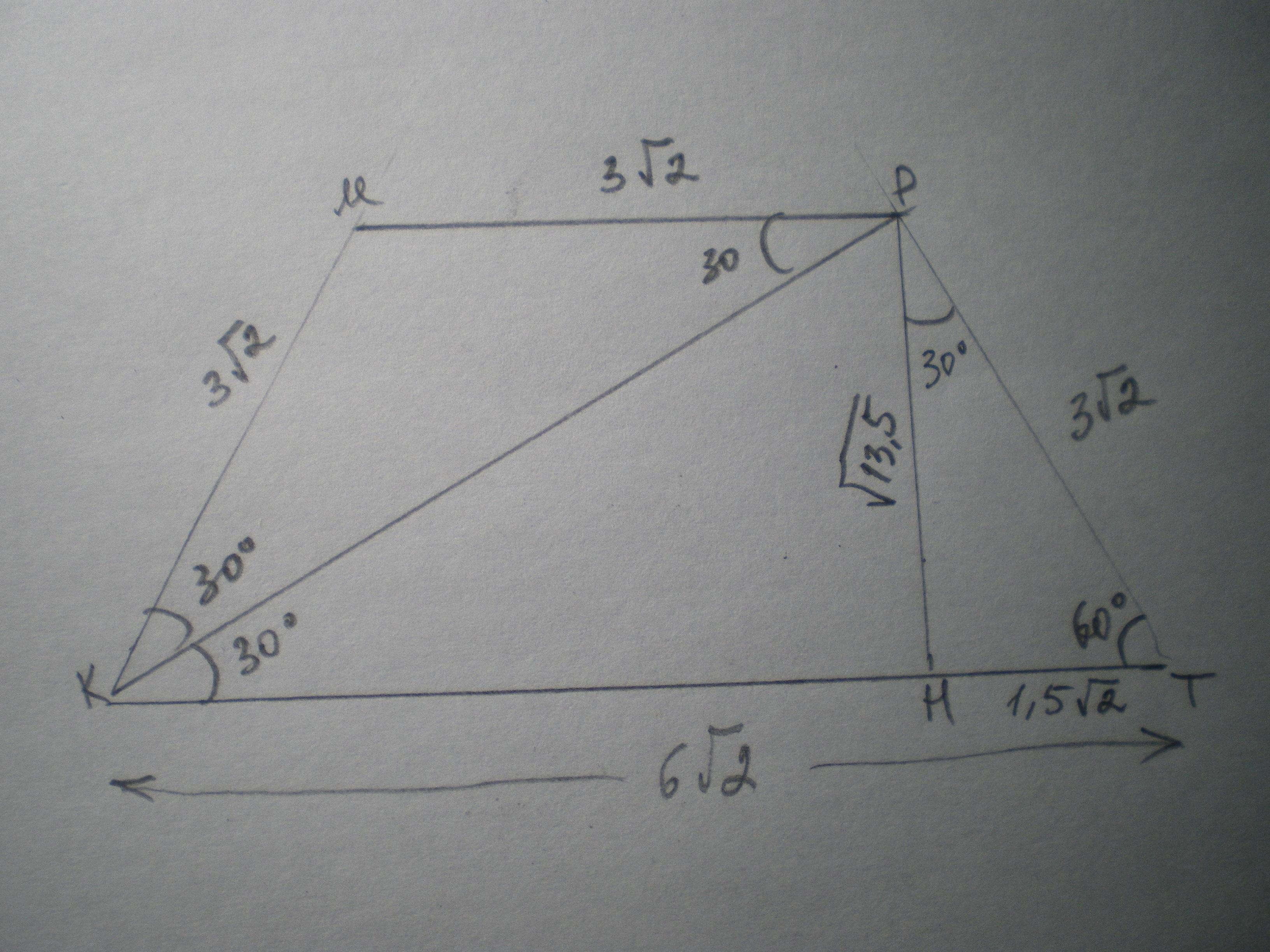 S(КМРТ)=(МР+КТ)/2 * РН = (6√2+3√2)/2 *√(13,5)=