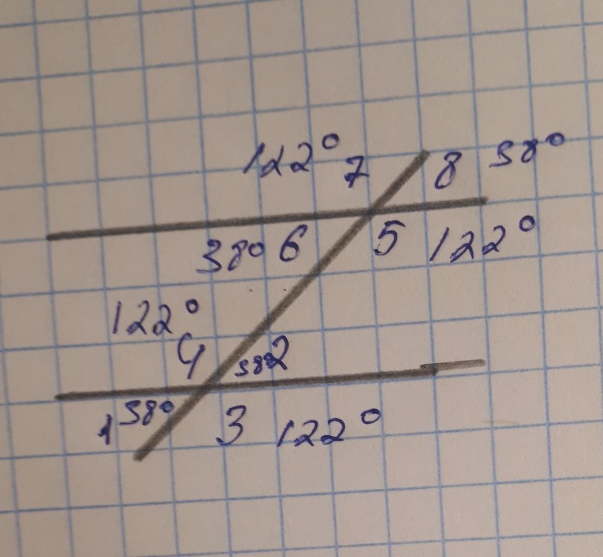 угол 5 будет равен углу 4 как накрест лежащий= 122