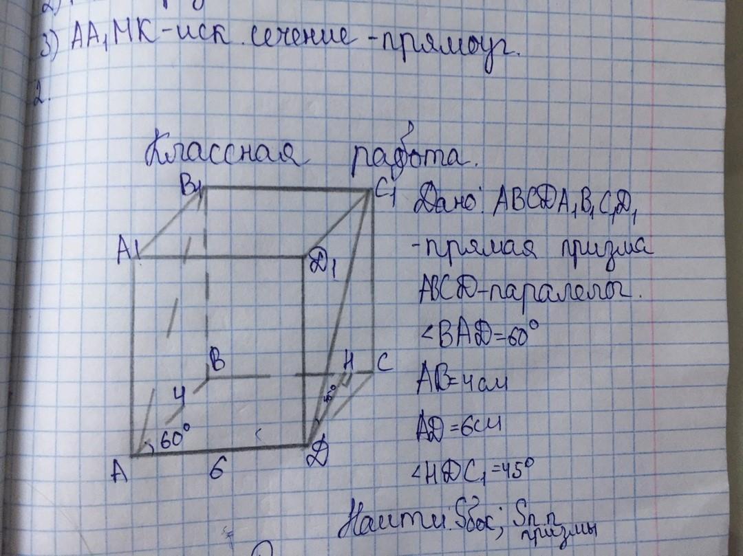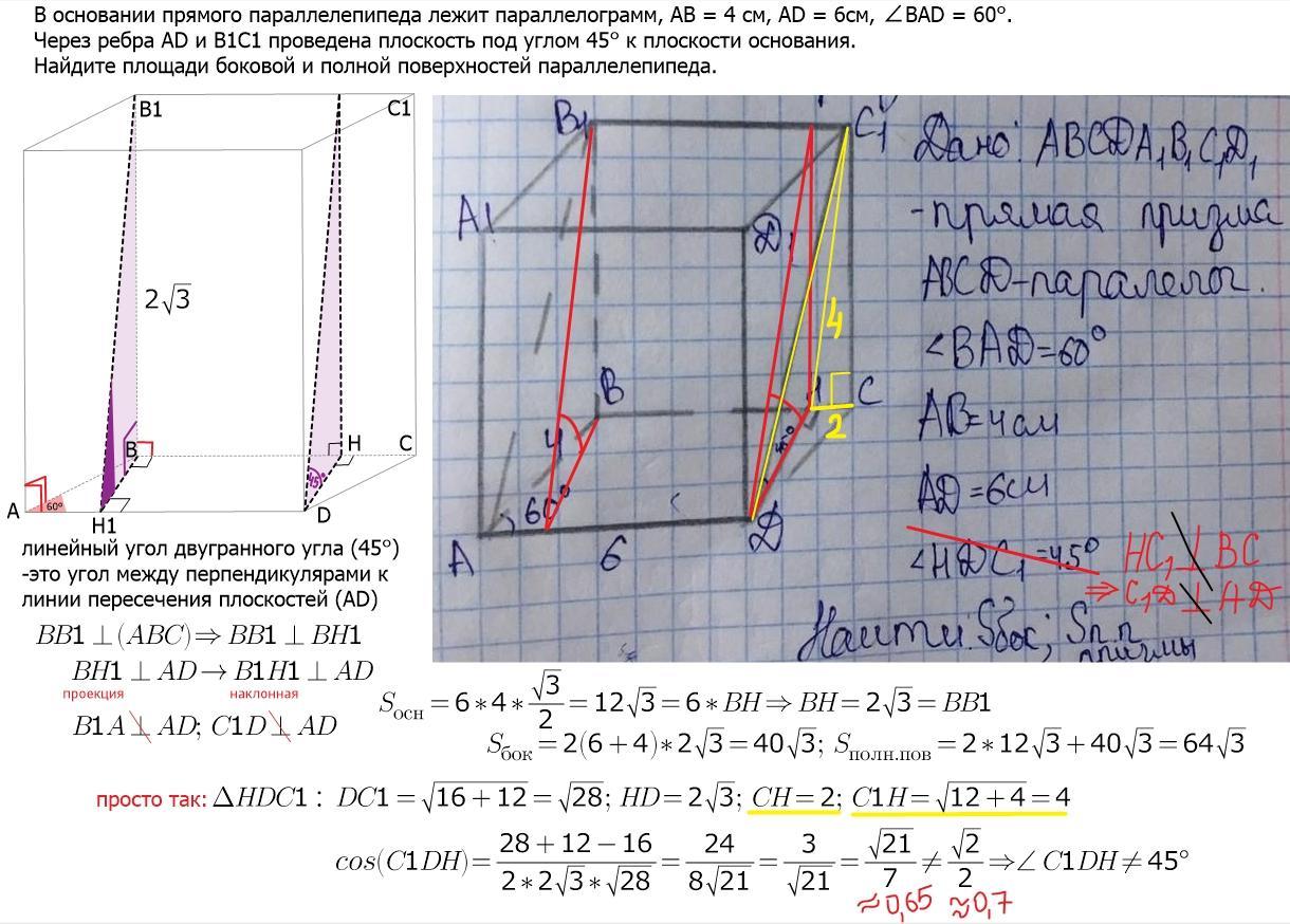 В основании прямого параллелепипеда лежит параллелограмм, АВ = 4 см, AD=6см, угол BAD=60. Через ребра AD и B1C1 проведена плоскость под углом 45 к плоскости основания. Найдите площади боковой и полной поверхностей параллелепипеда .90б