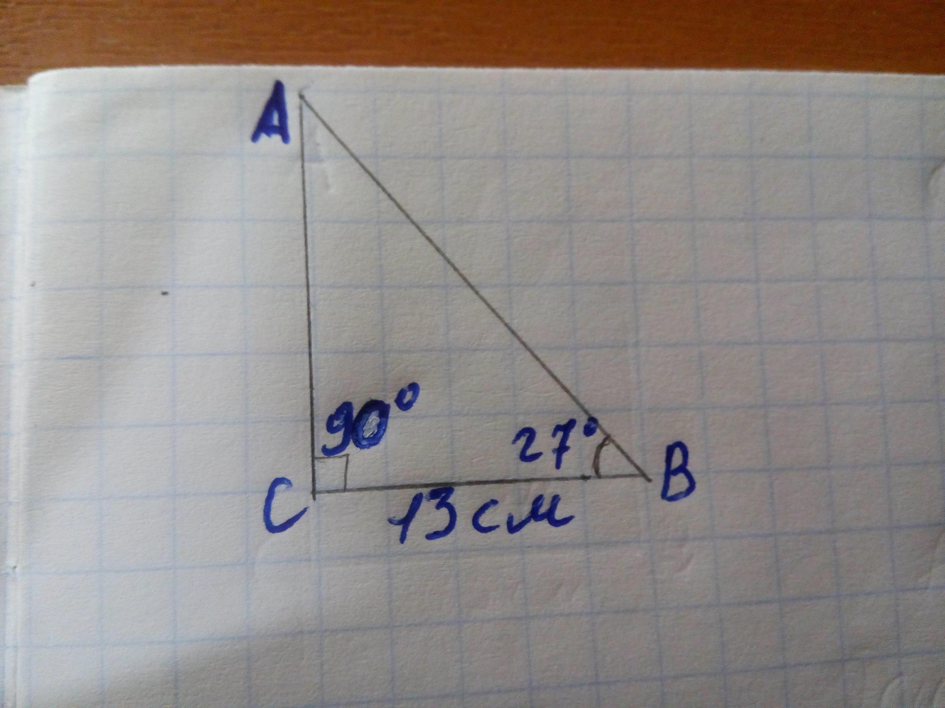 Найдем угол А: 90 - 27 = 63 градуса(сумма острых углов в прямоугольном треугольнике равна 90 градусов).