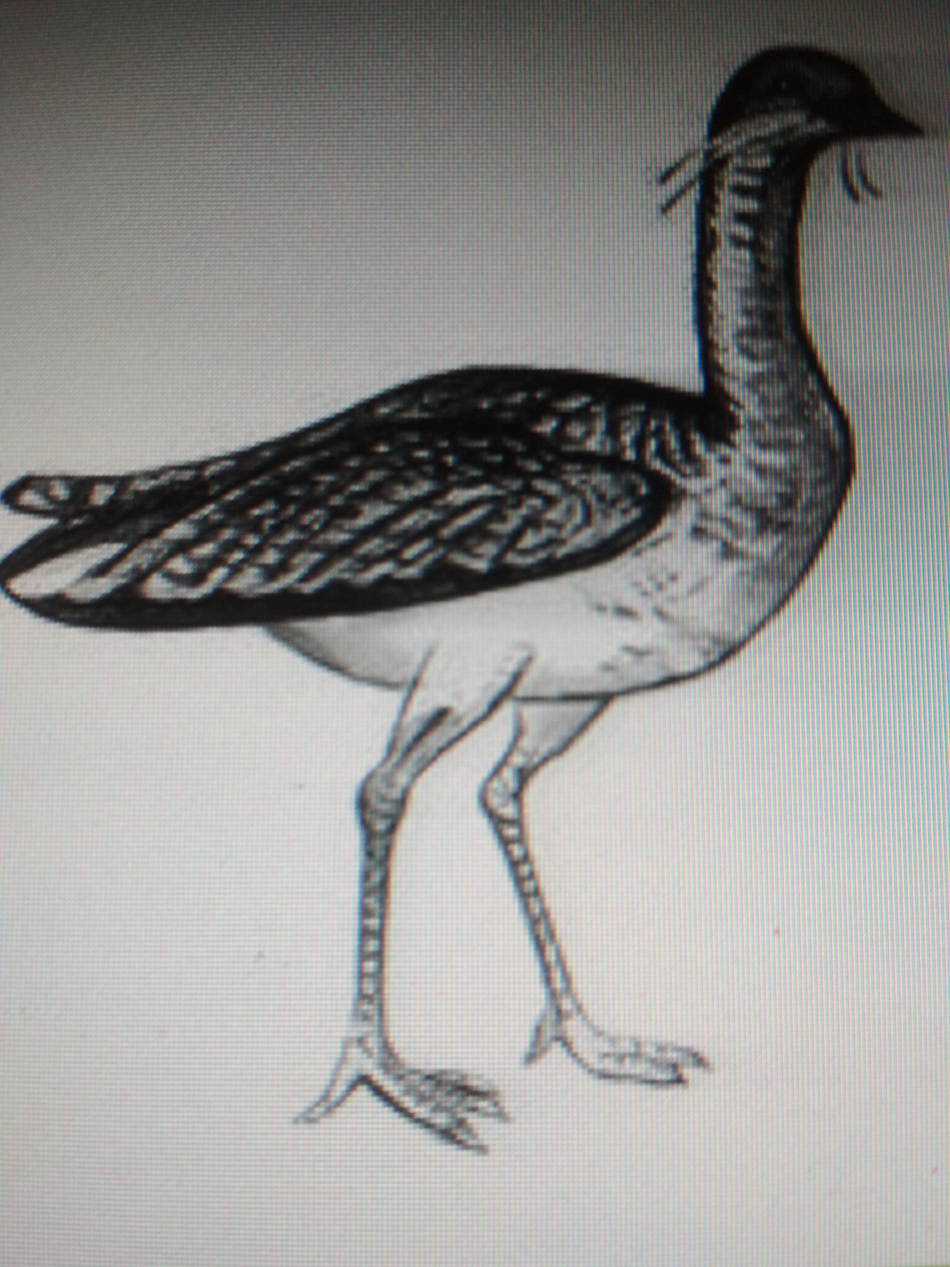 На рисунке изображена дрофа. Эта птица питается как растительной, так и животной пищей. Дрофа обитает в Евразии. Эта птица сухопутная, потому что у неё нет перепонок на лапах.