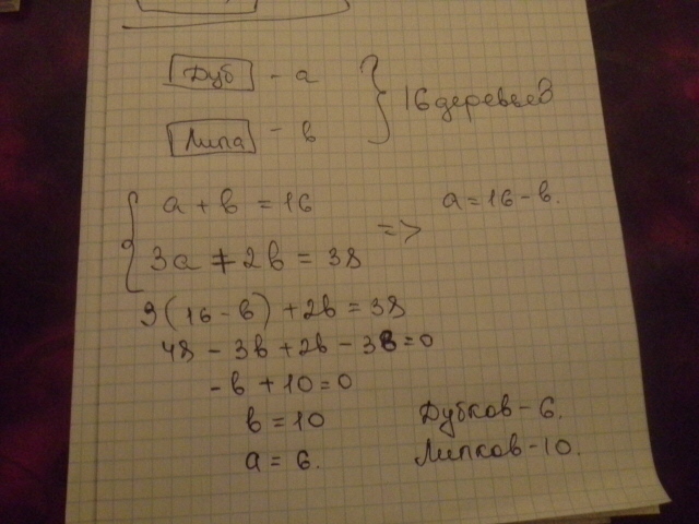 Возле нового дома растут 16 деревьев-дубки и липки.Если бы весной число дубков устроили,а число липок удвоили,возле дома росло бы уже 38 деревьев.Сколько дубков и сколько липок растет возле дома