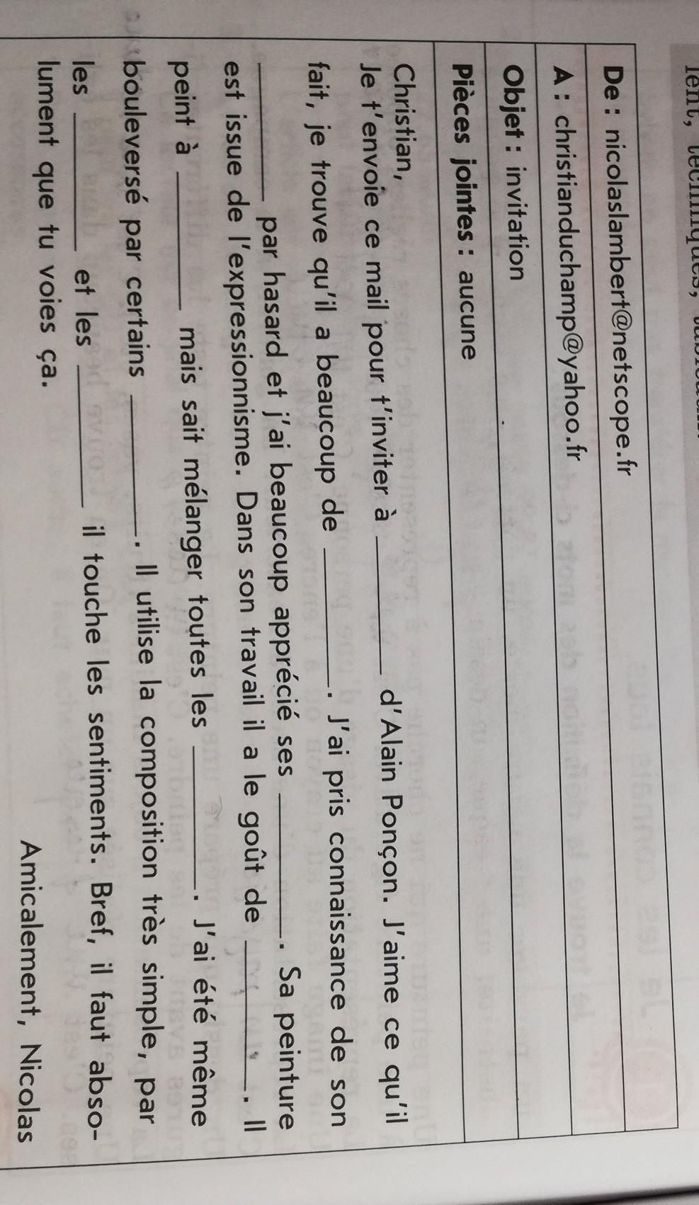 Кулигина, Щепилова 7 класс, рабочая тетрадь с 62, номер 3, нужно вставить слова: toiles, l'huile, couleurs, l'exposition,œuvre, l'expérience,formes, talent, techniques, tableaux.
