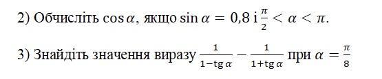 3) 1/(1-tgα) - 1/(1+tgα) = (1+tgα-1+tgα)/ ((1-tg²α) =2tgα/(1-tg²α)= tg2α= tg (2·π/8) = tg π/4=1