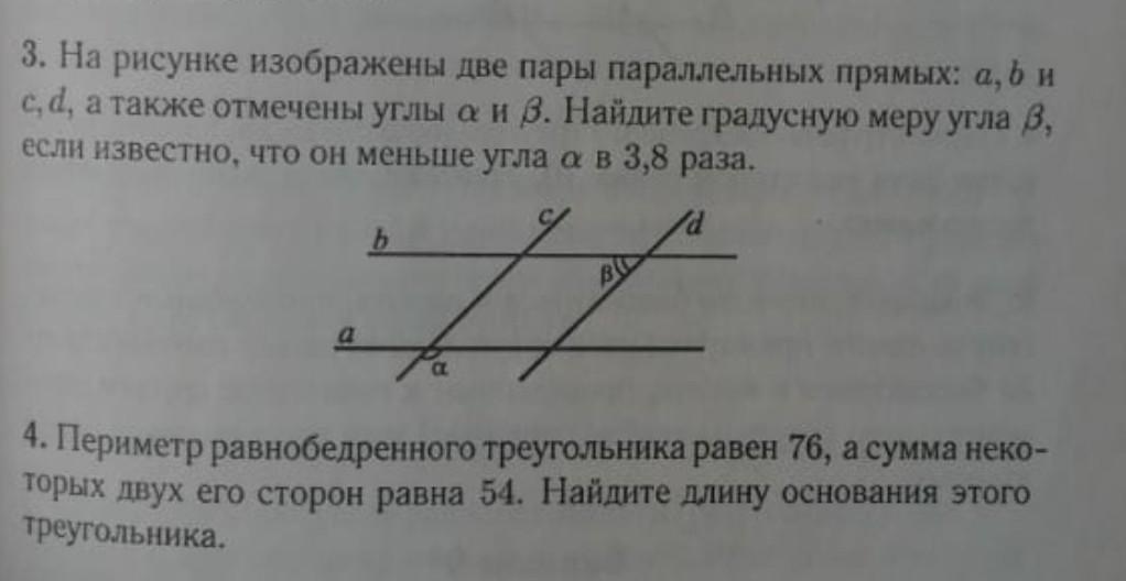 180 - угол альфа = угол 2 (они смежные углы) - внутренний накрест лежащий с углом 1 при а || b и секущей с, а угол 1 соответственный с углом бета при c || d и секущей b.