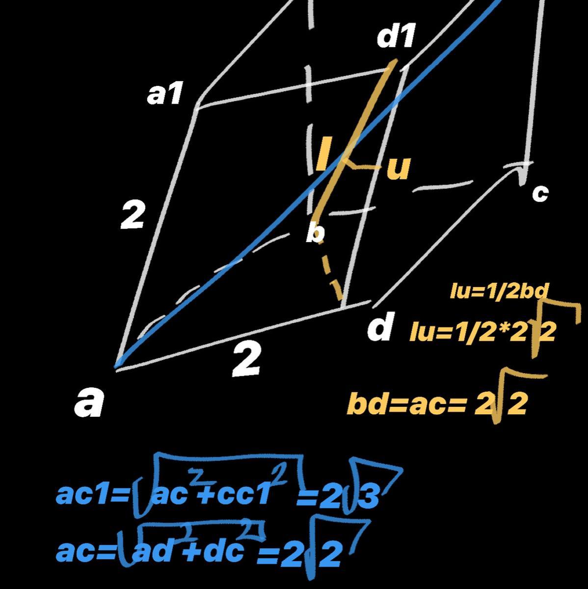 Дан куб ABCDA1B1C1D1 со стороной 2. Найдите диагональ куба и определите угол между BD1 и гранью DCC1D1.