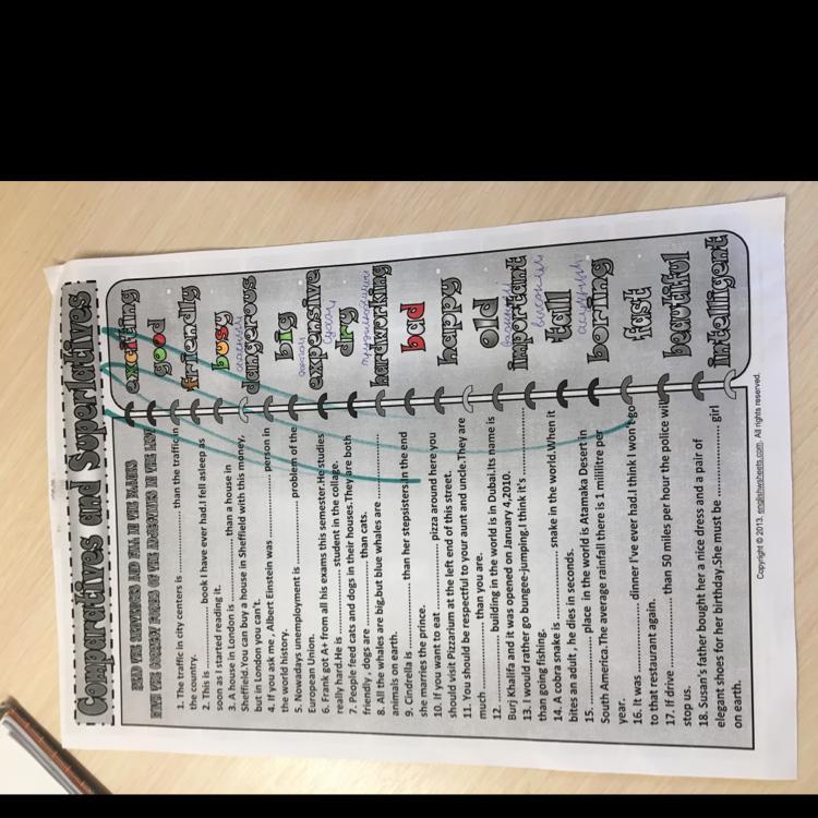 11.older 12. The tallest 13.more exciting 14. The most dangerous 15.the driest 16.the worst 17.faster 18. The happiest